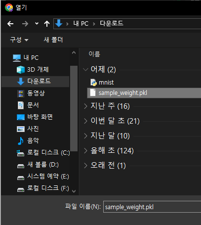 책에서 제공하는 github 저장소에서 파일( sample_weight.pkl)을 다운로드 받는다.
