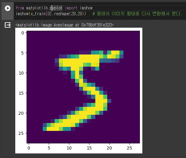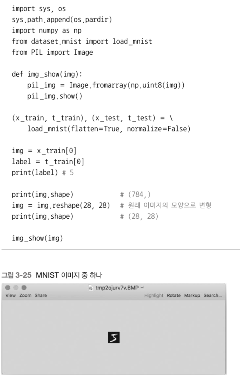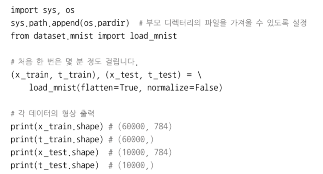 책에서 제공하는 데이터셋은 2차원(28x28)의 이미지를 flatten =True 처리했기에 1차원(784)으로 나온다.