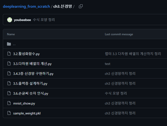 https://github.com/youbeebee/deeplearning_from_scratch/tree/master/ch3.%EC%8B%A0%EA%B2%BD%EB%A7%9D