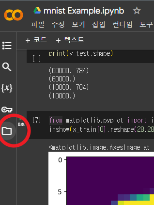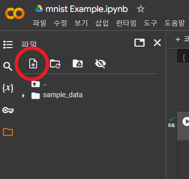colab 좌측 메뉴에서 file아이콘(빨간 원)을 클릭한다