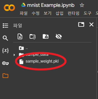 init_network에서 사용되는 sample_weight.pkl 파일을 colab에 upload 한다.